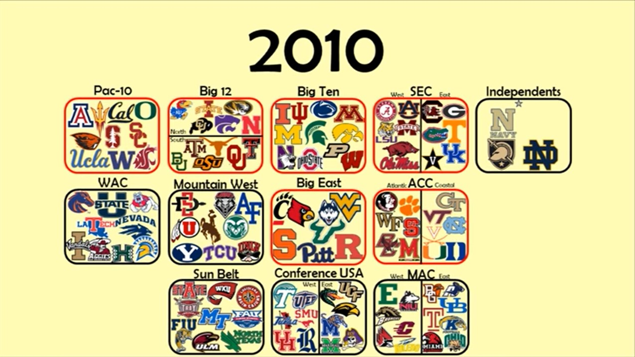 In 2024, college football at the FBS level will go through another major conference realignment shakeup. The next wave of realignment will essentially kill the PAC 12, stretching the ACC, Big Ten, and Big 12 over 3 or more time zones for schools. The conferences have grown to 16 , 17 and 18 schools and that seems like a bit too much. No reason Miami and Cal are in the same conference, or Rutgers and UCLA considered a conference game. It is very unrecognizable for a college football historian or traditionalist. So I think we should make it uniform across all conferences to have 12 schools. Here’s how the college football landscape looked back in 2010 right before everything got out of hand.